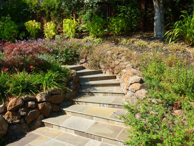 Dry laid walls, stone, fencing and plantings tie together a site with many hidden areas.