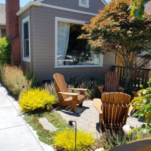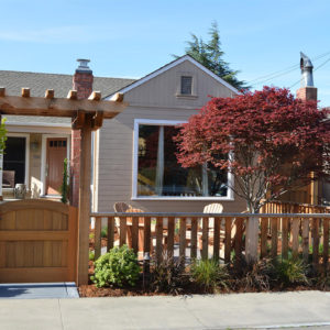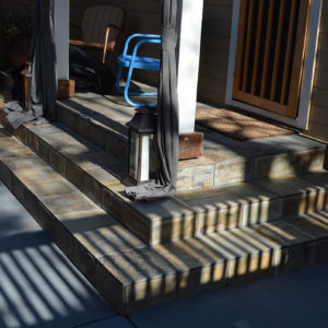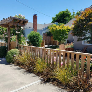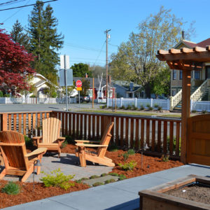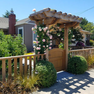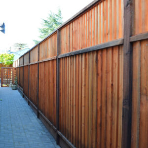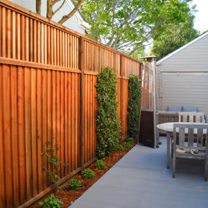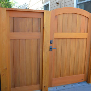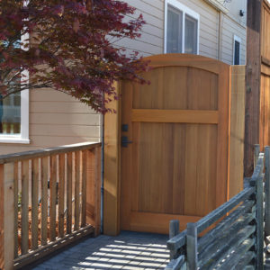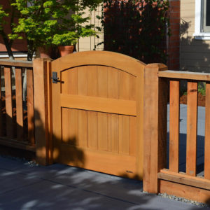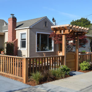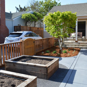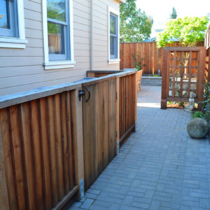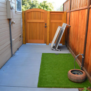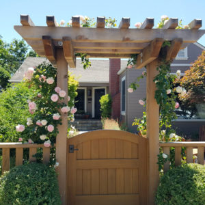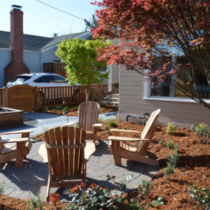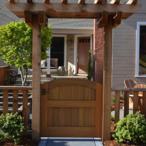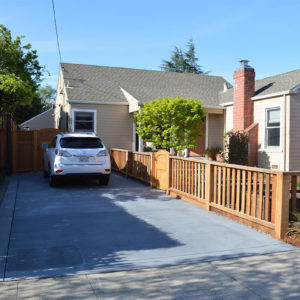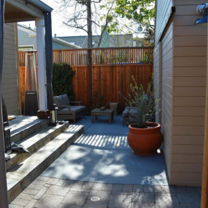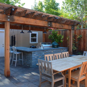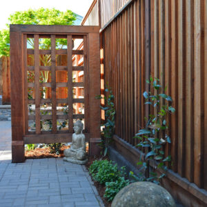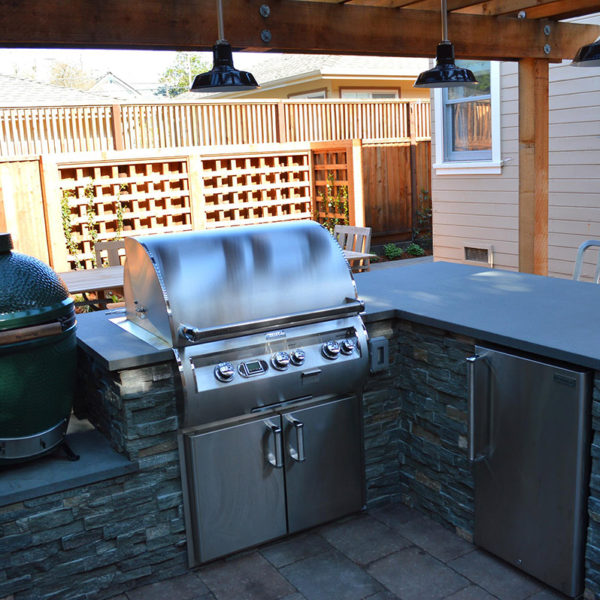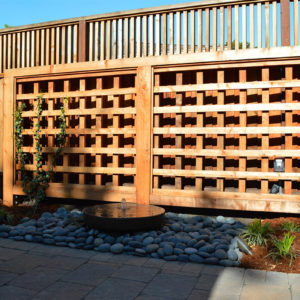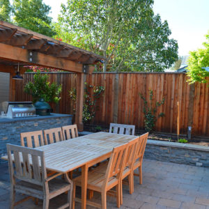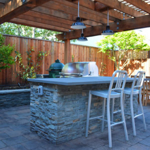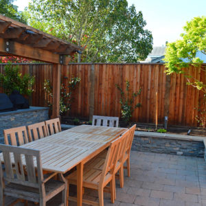 The project featured a lot of interesting custom woodwork- new pergolas, all new fencing, and custom Cedar accent gates. These complimented all new paving- a new colored concrete driveway, paver seating area, and rear paver patio. Accent lighting and a polished granite water feature served as accents, while a backyard BBQ included a new grill, fridge and Big Green Egg smoker.